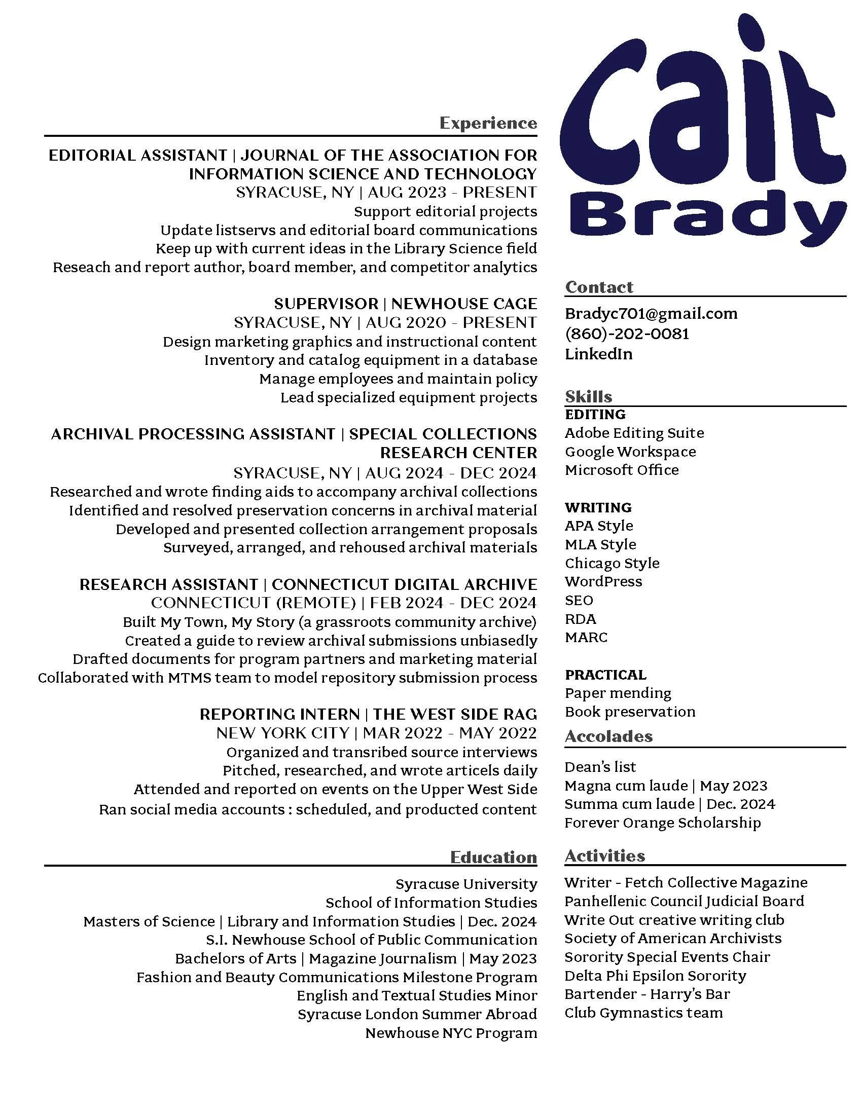 I hold a Bachelors degree in Magazine Journalism from the S.I. Newhouse School of Public Communication at Syracuse University as well as a Masters degree in Library and Information Science from Syracuse University (SU). My time at SU influenced my dedication to equal and ethical representation in archives and a passion for inclusivity in literature.